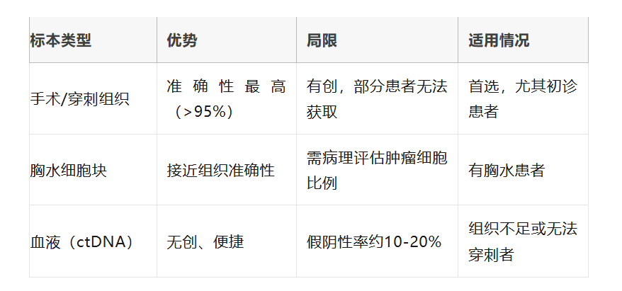 液体活检:胸水、脑脊液、血液等标本,可检测肿瘤突变热点及循环DNA(ctDNA),适用于无法取到足够组织的患者,便捷但存在一定假阴性可能。